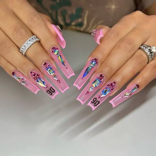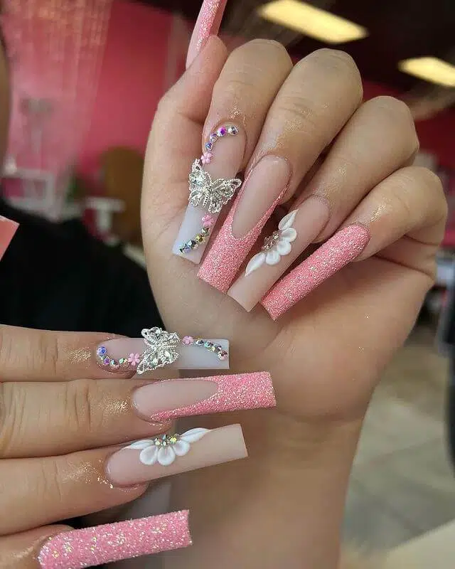 For a sophisticated and glamorous manicure, try combining pink with nude tones. This design features soft pinks paired with nude shades and embellished with glitter, metallic foils, or rhinestones for an elegant look. It’s perfect for weddings, parties, or any occasion where you want a chic and timeless manicure.