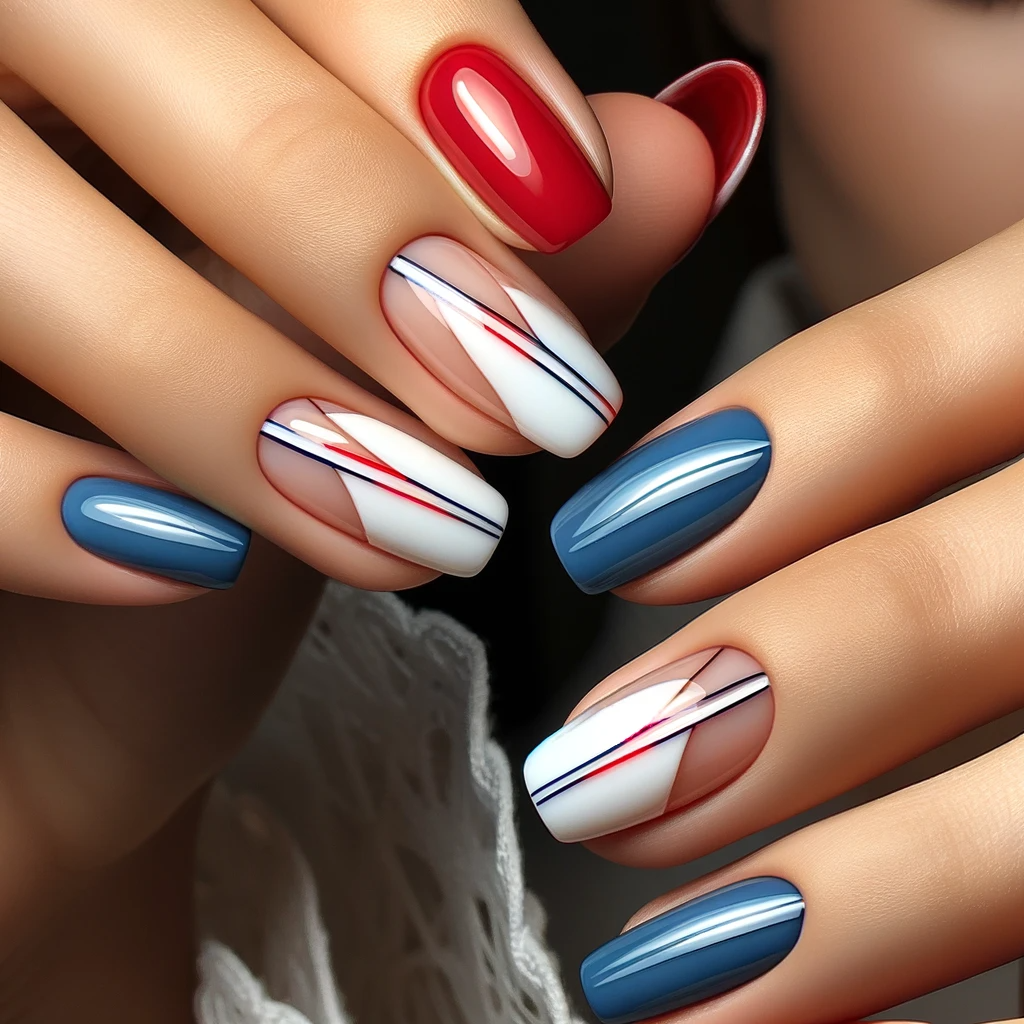 Chevron patterns are a fun and dynamic way to incorporate the Bills’ colors into your manicure. Use alternating red, white, and blue to create a chevron stripe pattern across each nail. You can either go for a full-chevron look on all your nails or feature the pattern on an accent nail for a more subtle approach. The geometric pattern adds a modern, trendy feel to your nails while still being unmistakably tied to your team’s colors.