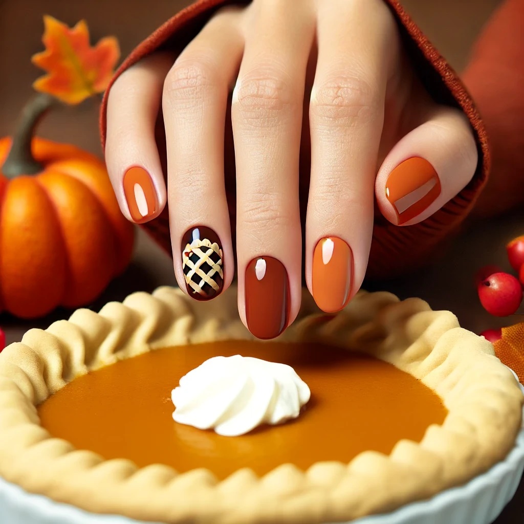 Everyone loves pie at Thanksgiving, and now you can incorporate it into your nail design! Choose one or two accent nails to feature a tiny slice of pie, whether it’s pumpkin, apple, or pecan. Pair it with autumnal shades like cinnamon brown and golden crust colors for a mouthwatering look.