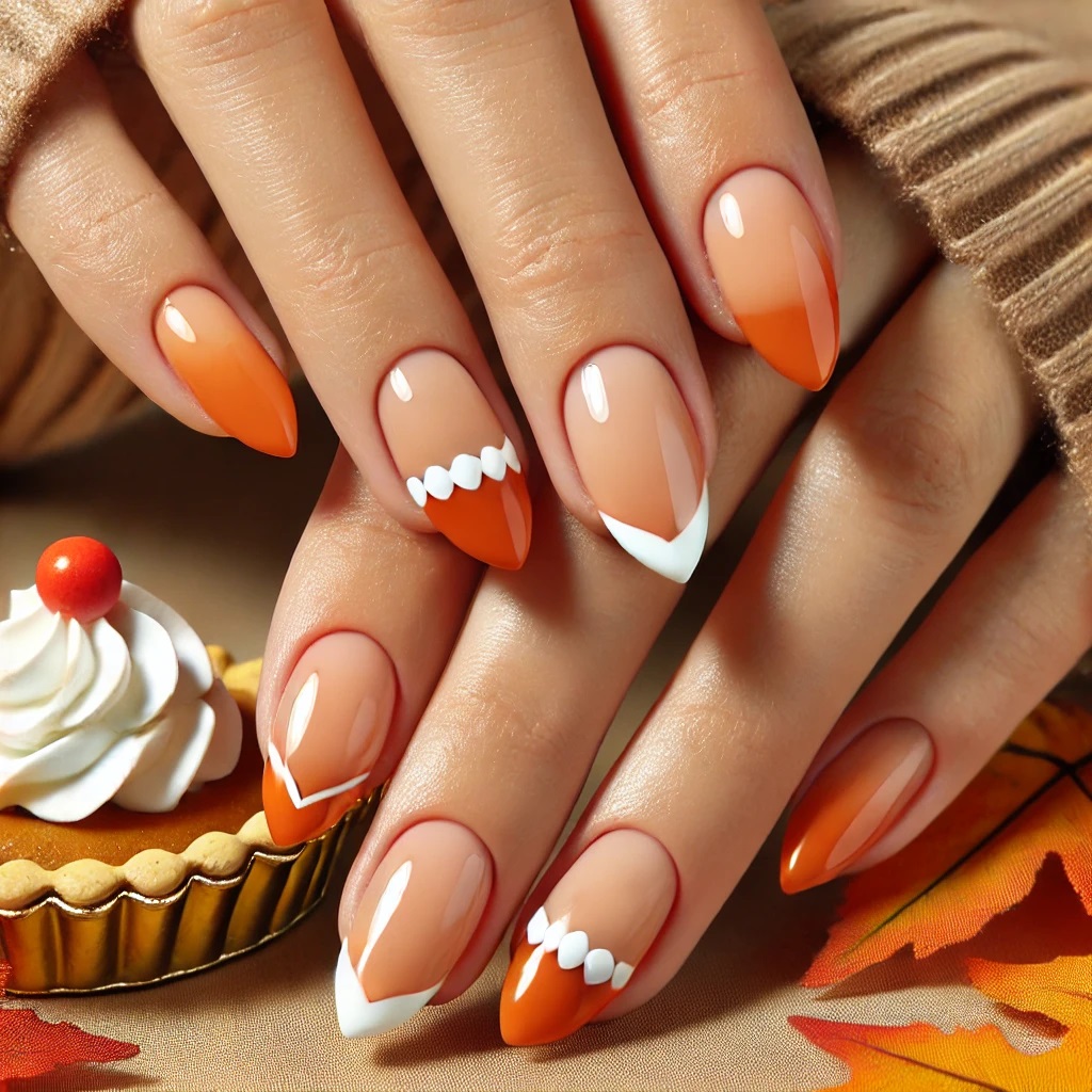 Bring one of Thanksgiving’s most iconic desserts to your nails with a pumpkin pie-inspired design. Picture pumpkin-colored tips with a tiny slice of pie or dollop of whipped cream painted on one or two accent nails. You can also add a cute checkered napkin pattern to the design to evoke the feeling of a cozy, homemade dessert. This fun and creative nail art idea is perfect for anyone who loves Thanksgiving treats.