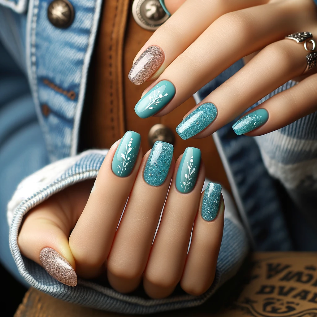 Capture the essence of the Southwest with a turquoise and silver glitter design. Start with a vibrant turquoise base and add silver glitter tips or accents. This design is not only eye-catching but also embodies the beauty of Native American jewelry, making it perfect for any Western-themed event.
