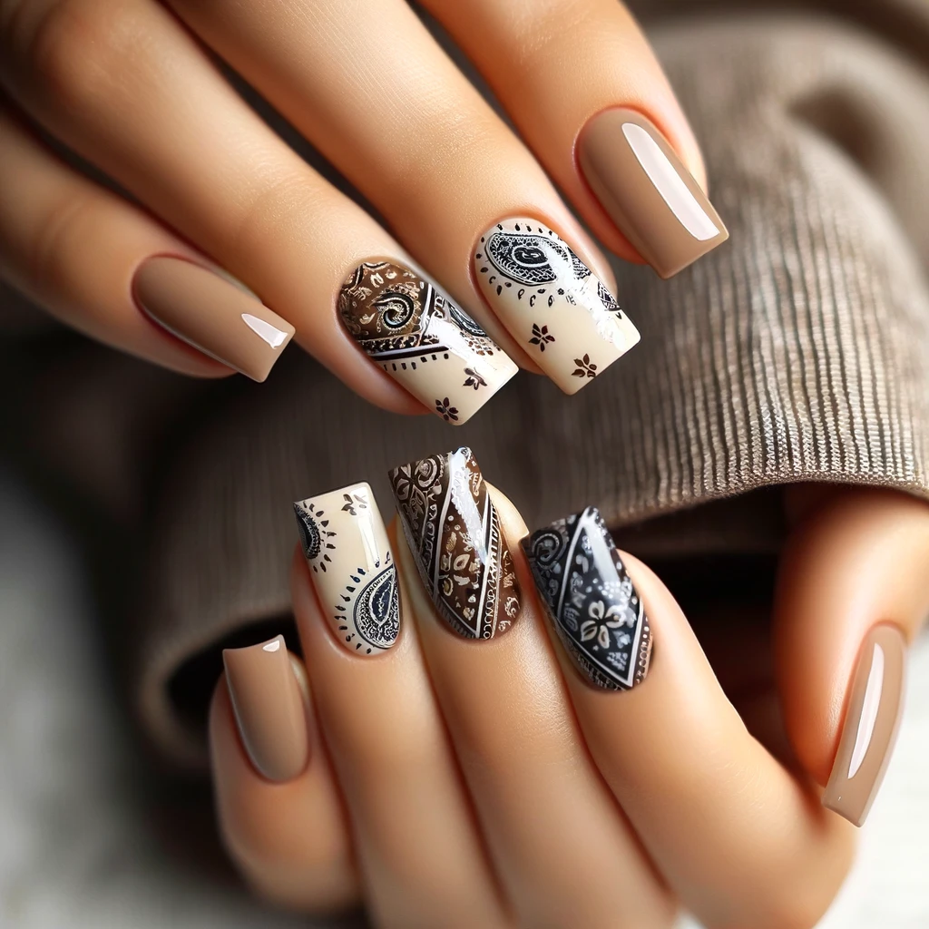 Get creative with a Western paisley print design. Use a base color of your choice and paint intricate paisley patterns in complementary colors. This elegant design is reminiscent of classic Western bandanas and adds a touch of sophistication to your manicure.